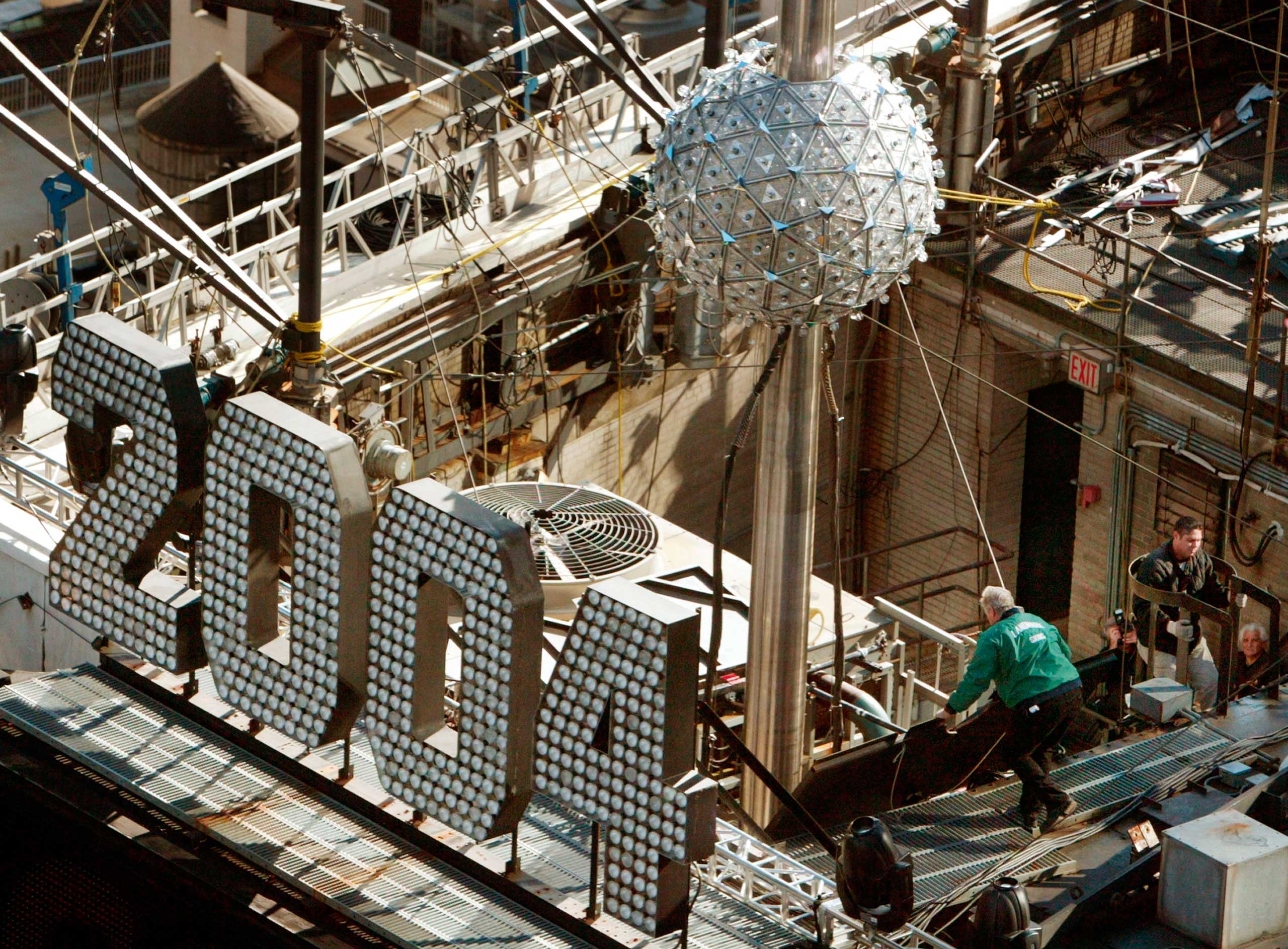 On Dec. 30, 2003, workers tested a 1,070-pound, six-foot diameter Waterford Crystal ball. The ball is suspended from a 77-foot flagpole atop the One Times Square building, about 400 feet above Times Square.