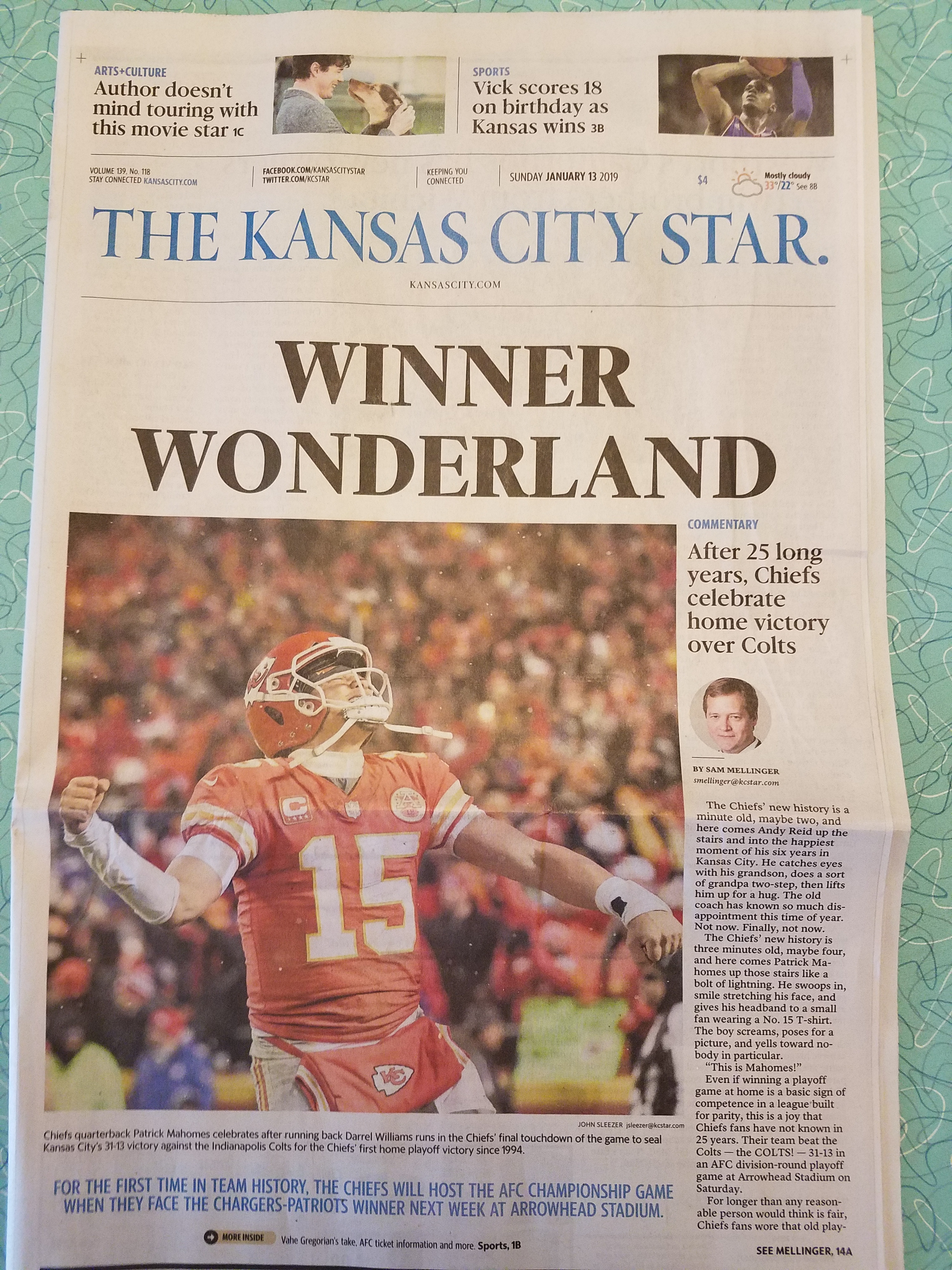 For those of you who don’t get the print edition, or are out of town, or couldn’t fish the paper out of the snow drifts, here are the headlines from yesterday’s memorable win over the Indianapolis Colts.
