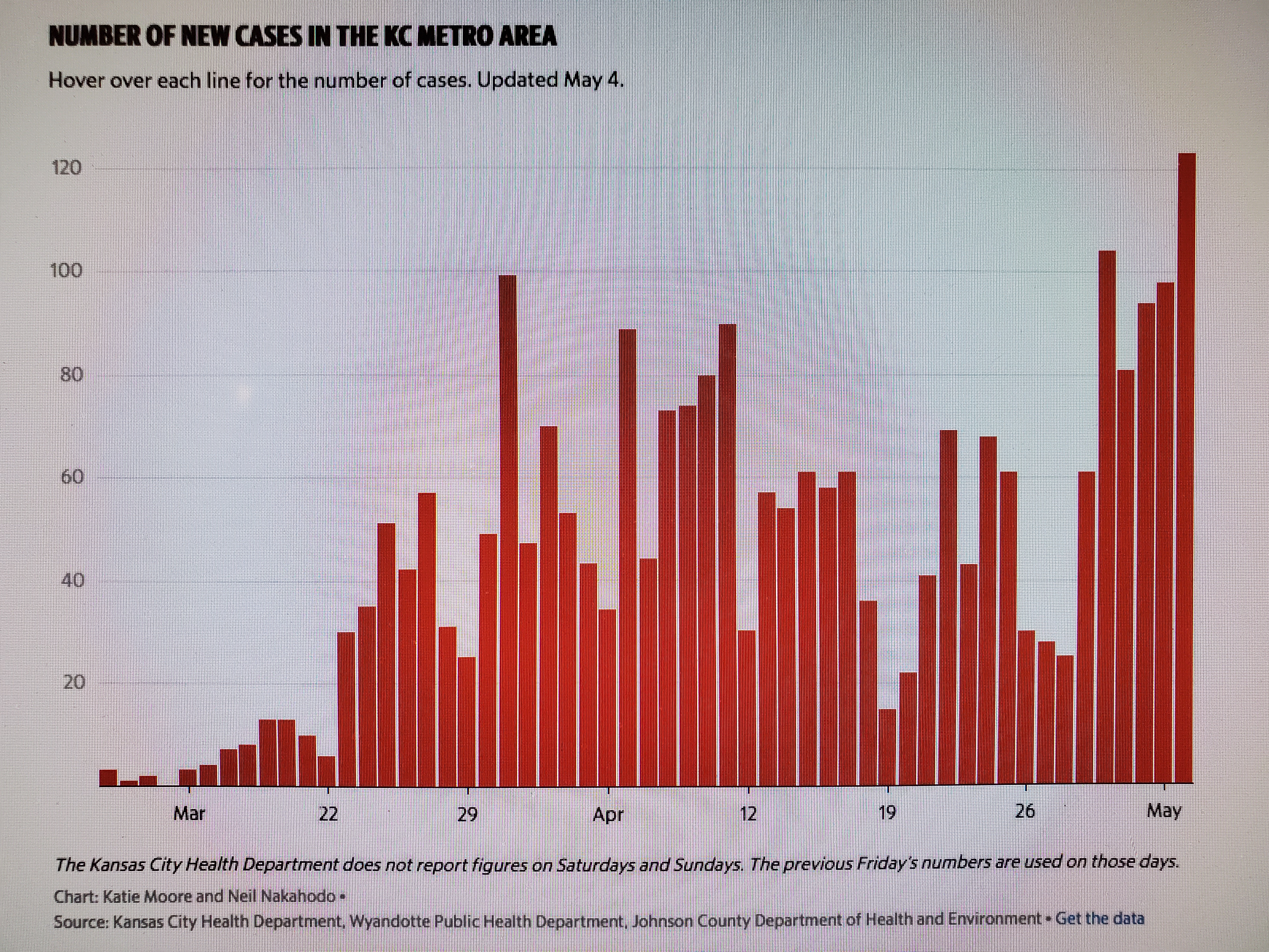 The first is the number of new coronavirus cases in the Kansas City area as of Monday. The area includes Kansas City and Jackson, Clay and Platte counties in Missouri and Johnson and Wyandotte counties in Kansas. On Monday, according to The Star, the area saw its “sharpest rise in the number of new COVID-19 cases.”