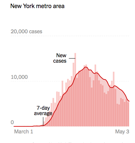 The next graphic shows the number of new cases in the New York City metro area.