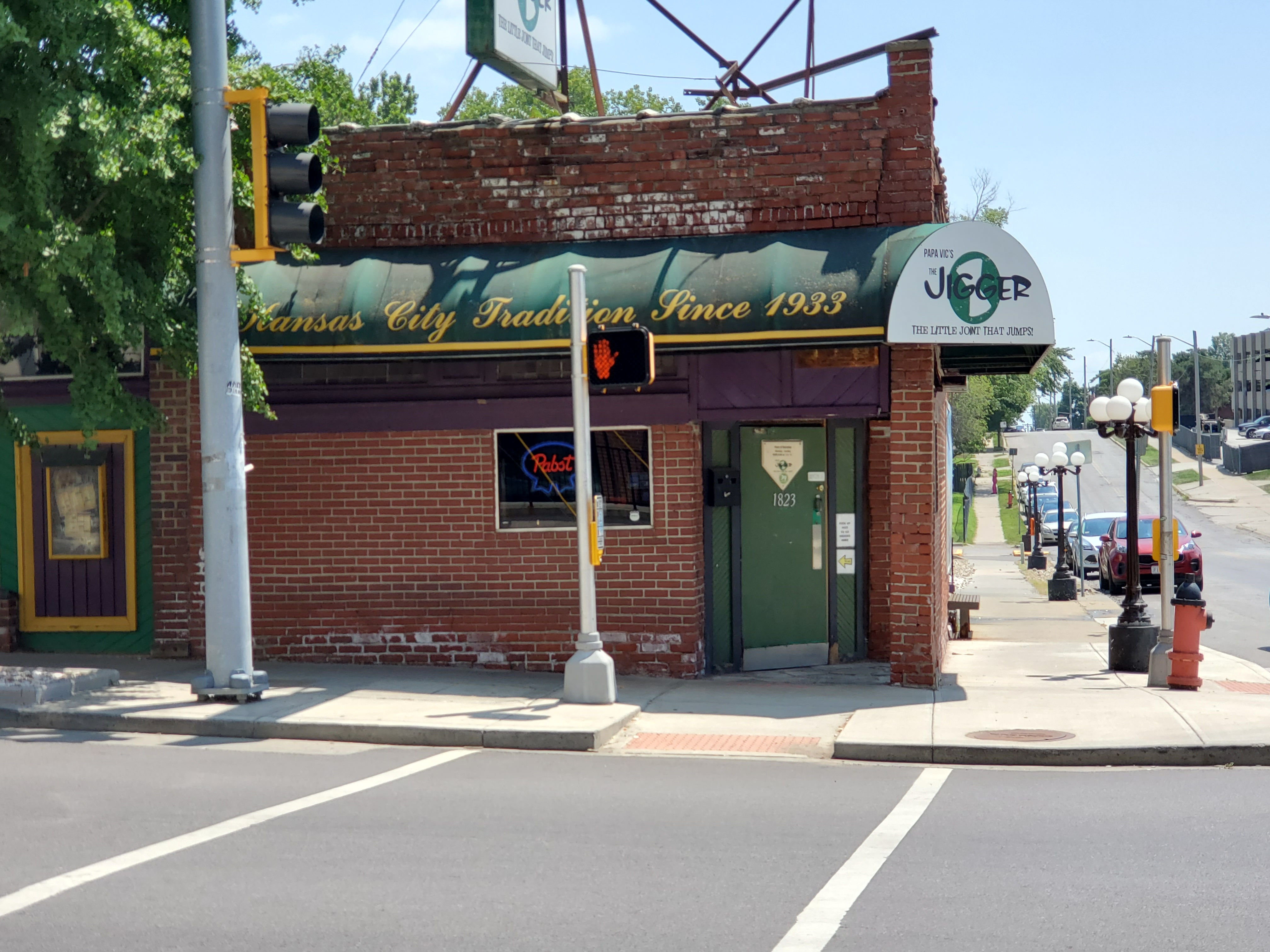 At 50th Street are the Westwood Hills shops, anchored, if you will, by Annedore’s Fine Chocolates (first awning at right). Another claim to fame for these shops is that George Brett’s wife Leslie once operated a business out of one of these store fronts.On the northeast corner of 47th Street is Westwood (MO) Park. On the Kansas side, 47th Place goes up a steep hill to the Woodside club, formerly Woodside Racquet Club. I played there many times years ago and was a member for a year or two. At 43rd Avenue, which picks up where Westport Road ends, is the Twin City Tavern, so named because it is in KCMO but borders KCK. As much time as I’ve spent on Westport Road, I’ve never been inside Twin City Tavern, at least not that I remember. For several years after I arrived in Kansas City, I drank a lot, and I cannot recall all my explorations during those years. Approaching 39th Street (39th Avenue on the Kansas side), the University of Kansas Health System commands the ground and the sky. The “campus” continues north of 39th, enveloping the northwest corner of 39th Avenue and State Line Road. A block or so to the west, the campus snakes down the hill on Rainbow Boulevard. When I arrived in Kansas City in 1969, about all there was to KU Med Center was the main building on the southeast corner of 39th and Rainbow.Now here’s one of my old haunts. When I first came to Kansas City, one of the first bars I went to was Jimmy’s Jigger, on the southeast corner of 39th Street. For years, all it consisted of was the bar and several booths on the westernmost wall (to the right of the front door). In the ’70s, it began expanding to the east, and a dance floor, a small stage and an upper bar were added. I remember meeting a very nice girl there — name was Nancy Gillespie — who was crazy about me and which I failed to appreciate until it was too late…The place is now called Papa Vic’s Jigger. For many of us, The Jigger it will always be. North of 39th, State Line Road starts petering out. All of a sudden, there’s far less traffic and not much to look at. Past 35th Terrace, the road curves to the left and becomes Eaton Street. (Eaton starts a few car lengths north of where the white vehicle is.) It’s an anticlimactic but fitting interruption point for a singular road.